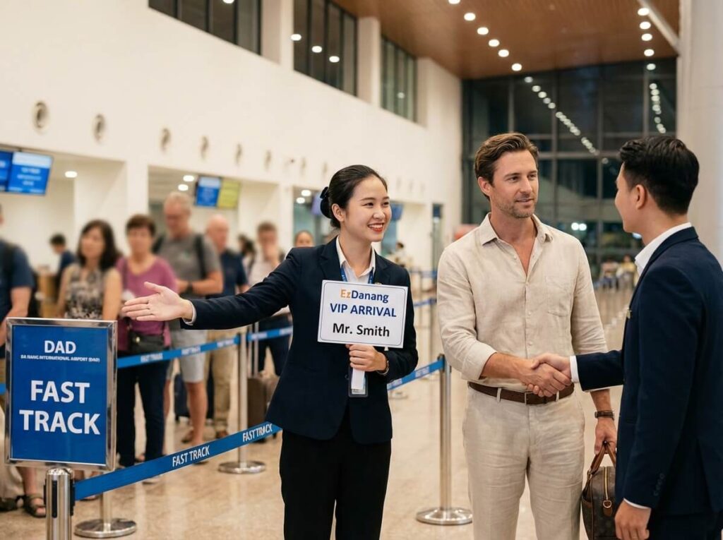 2. ✈️ 想要下飛機就一路暢通,完全不用煩惱嗎? 碰上連假或多個航班同時抵達時,峴港機場的海關排隊時間可能長達 1 到 2 小時。如果您帶著長輩小孩,不想讓他們久站排隊,或者擔心自己處理落地簽手續太繁瑣,EzDanang 提供專業的**「機場 VIP 快速通關服務」**! 我們的專員會在您下飛機進入航廈時舉牌迎接,帶您走專屬的 VIP 通道,免去排隊之苦,幾分鐘內迅速通關。出關後,再由專屬司機無縫接送至您的飯店,讓您的峴港假期從第一秒就充滿尊榮感!歡迎透過 LINE 向我們諮詢。關後專車無縫接送至飯店!